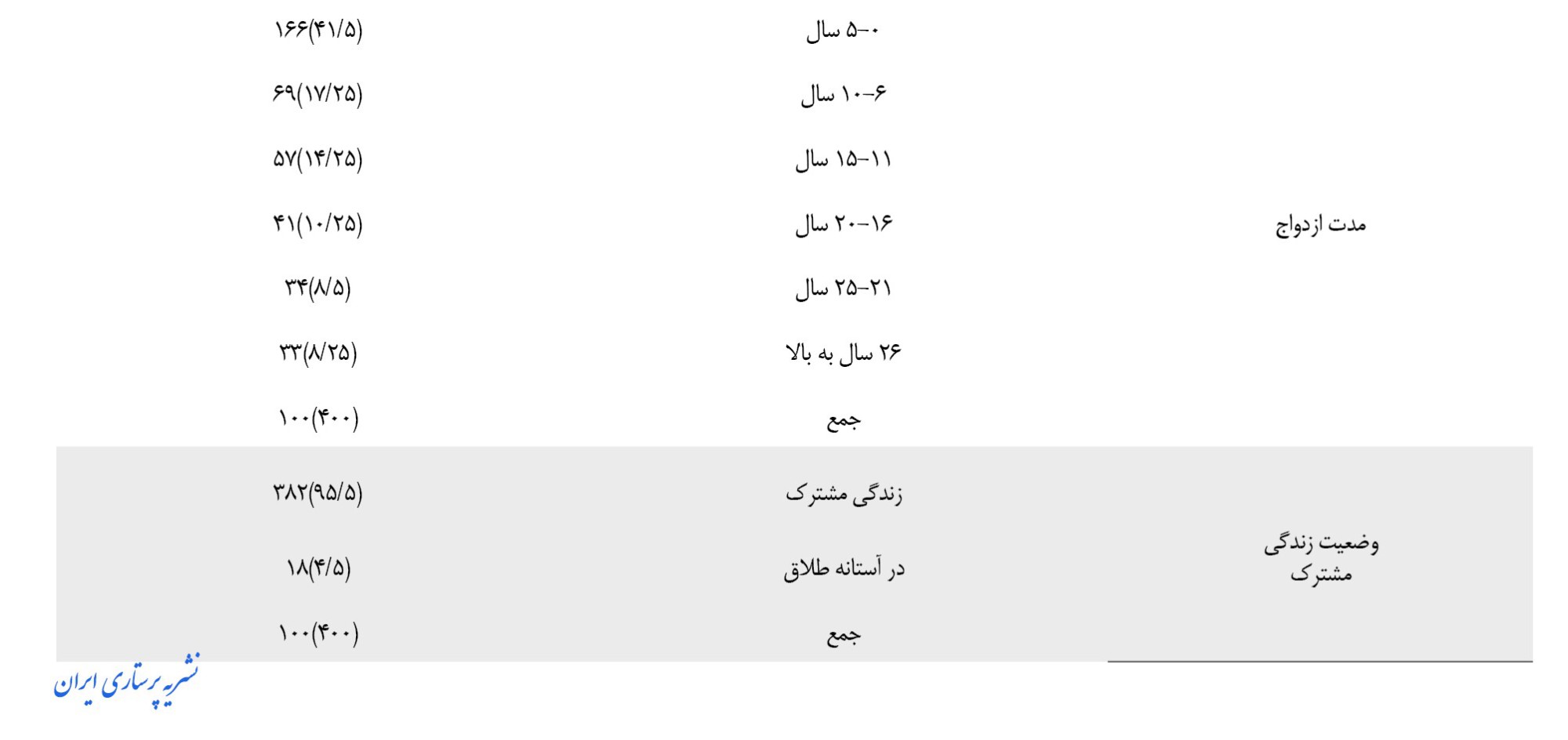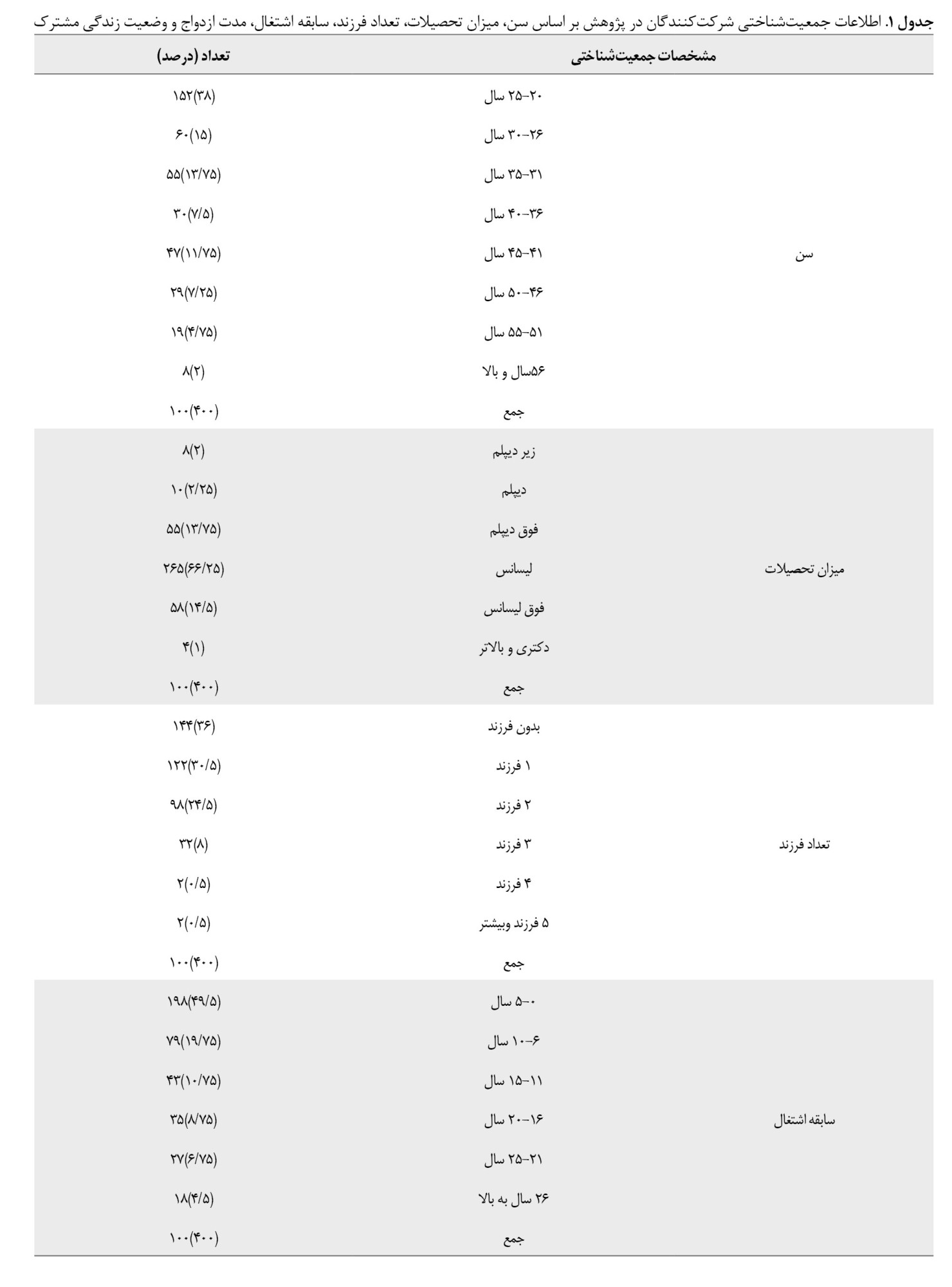 نتایج جدول شماره 1 نشاندهنده آن است که ازنظر سن (سن 20-25 سال 152 نفر 38 درصد بیشترین و سن بیش از 56 سال 8 نفر 2 درصد کمترین)؛ ازنظر میزان تحصیلات (لیسانس 265 نفر 25/66 درصد، براساس تعداد فرزند، بدون فرزند با 144 نفر 36 درصد؛ از نظر سابقه اشتغال (تا 5 سال سابقه، 198 نفر 49/5 درصد براساس مدت ازدواج، تا 5 سال ازدواج 166 نفر 41/5 درصد همچنین ازنظر تفکیک وضعیت زندگی مشترک (در حال زندگی مشترک با 382 نفر 95/5) بیشترین تعداد شرکتکنندگان بودند