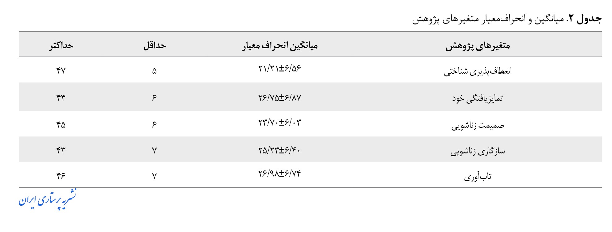 باتوجهبه جدول شماره 2، بیشترین میانگین و انحرافمعیار در تابآوری برابر با 26/6±98/74 بود که کمترین نمره 7 و بیشترین آن 46 به دست آمد. همچنین کمترین میانگین و انحرافمعیار در انعطافپذیری شناختی برابر با 6/56± 21/21 بود که کمترین نمره 5 و بیشترین آن47 به دست آمد.