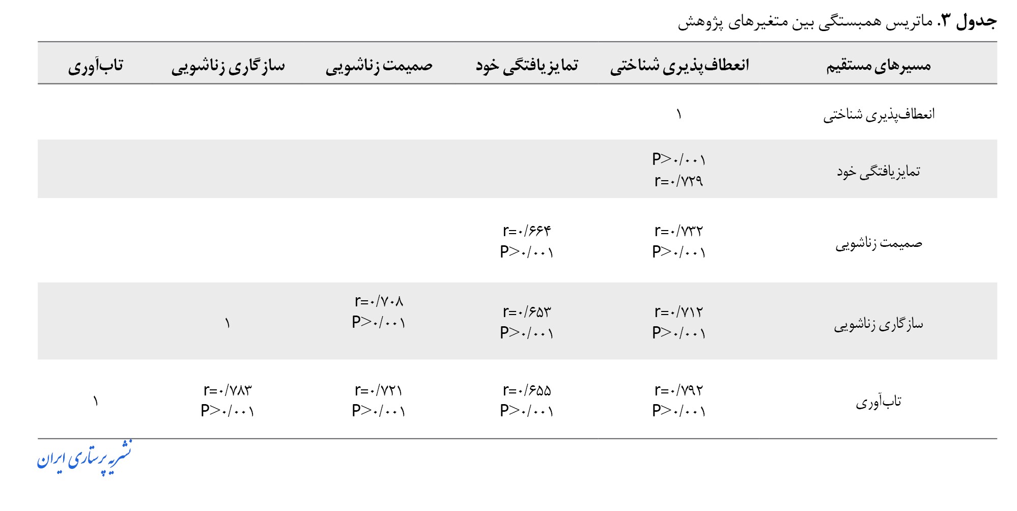 آلفای کرانباخ انعطافپذیری شناختی 0/843 صمیمیت زناشویی 0/819، تمایزیافتگی 0/796، سازگاری زناشویی 0/859 و تابآوری 0/787 گزارش شده است.