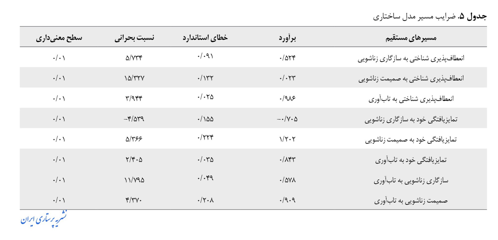 همانطور که در جدول شماره 5 مشاهده میشود بارهای عاملی استاندارد در زیر ستون برآورد نمایش داده میشوند که برای مسیر انعطافپذیری شناختی به صمیمیت و سازگاری زناشویی بهترتیب 2/023 و 0/524، برای مسیر انعطافپذیری شناختی به تابآوری 0/986، برای مسیر تمایزیافتگی خود به صمیمیت و سازگاری زناشویی بهترتیب 0/842 و 0/705-، برای مسیر تمایزیافتگی خود به تابآوری 0/842 و برای مسیر صمیمیت و سازگاری زناشویی به تابآوری 0/909 و 0/578 به دست آمد که همگی بالای 0/5 میباشد. خطای استاندارد مسیرهای فوق برای صمیمیت زناشویی نیز بهترتیب 0/132، 0/025، 0/291، 0/253، 0/224، 0/035 و 0/208 حاصل شد و برای سازگاری زناشویی نیز بهترتیب 0/091، 0/025، 0/202، 0/253، 0/155، 0/035 و 0/049به دست آمد. همچنین نسبت بحرانی که از تقسیم برآورد بر خطای استاندارد حاصل میگردد. برای صمیمیت زناشویی بهترتیب 15/327، 3/944، 10/487، 3/458، 5/366، 2/405 و 4/370 حاصل شد و برای سازگاری زناشویی بهترتیب 5/734، 3/944، 9/810، 3/458، 4/539-، 2/450 و 11/795 به دست آمد و برای همه مسیرهای فوق معنادار به دست آمد.