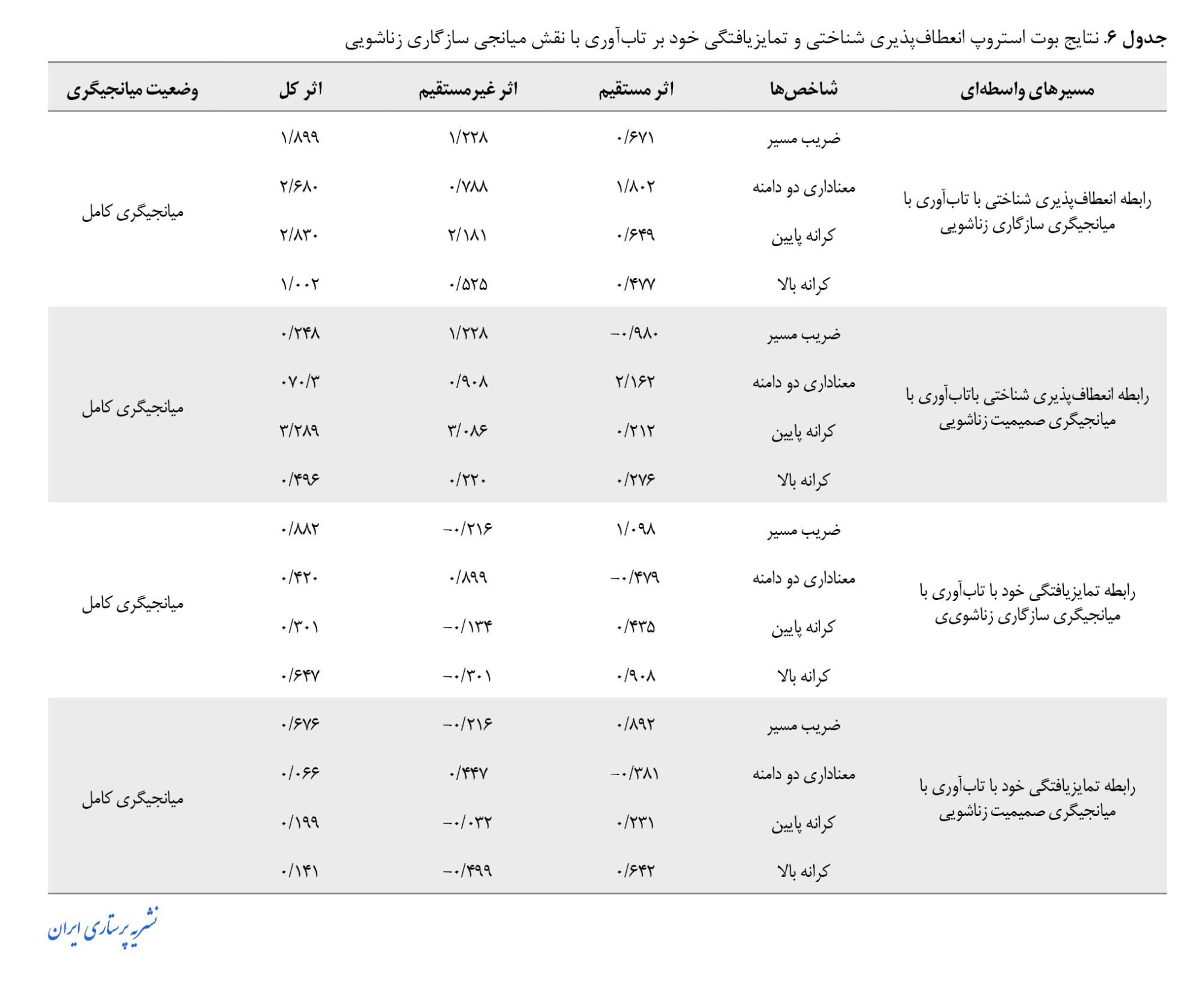 همانطورکه در جدول شماره 6 مشاهده میشود، ضرایب مسیرهای مستقیم انعطافپذیری شناختی، تمایزیافتگی خود، صمیمیت زناشویی و سازگاری زناشویی بر تابآوری معنادار بودند. در ادامه جهت بررسی رابطه غیرمستقیم مدل پیشنهادی از روش بوت استروپ استفاده شده است. نتایج جدول شماره 6 بوت استروپ برای بررسی مسیرهای واسطهای غیرمستقیم در جدول شماره 4 ارائه شده است.
